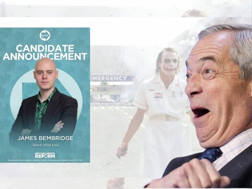Increasingly, Reform UK’s lineup for the local elections looks like something out of the Monster Mash. The latest horrorshow we’re drawing your attention to is James Bembridge. Much like Nigel Farage, Bembridge has stated a desire to get rid of the publicly run NHS.
