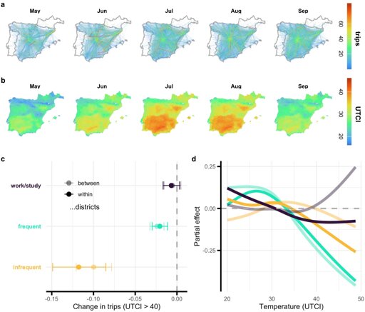 Mobile phone data on 13 million people in Spain—more than a quarter of the population—show that hot days reduce individual mobility, thereby reducing social mixing and making city centers less vibrant. As the climate warms, heat could reshape society, increasing heat-related illness, shifting some physical and outdoor activities to evening and night hours, and altering daily movement patterns.