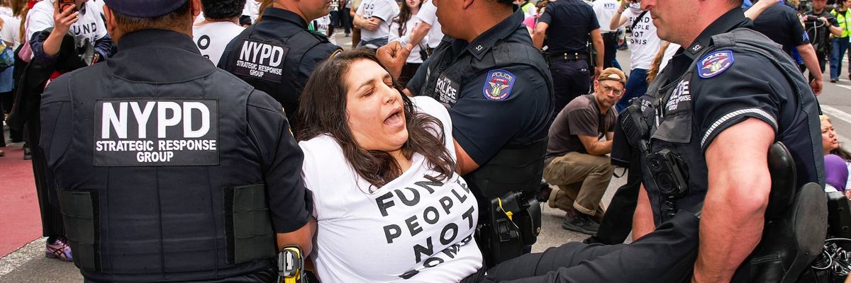 Whistleblower Chelsea Manning, MPower Change founder Linda Sarsour, and actor Hari Nef were three of around 100 people who were arrested outside the New York City offices of Senate Minority Leader Chuck Schumer and Sen. Kirsten Gillibrand on Monday after the activists joined hundreds of anti-war campaigners in demanding the two Democrats vote against more weapons for Israel and block the Pentagon’s $100 billion request to fund President Donald Trump’s deeply unpopular war on Iran.