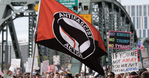An antifascist action flag is displayed as protesters take part in the nationwide No Kings” protest against the authoritarian policies of President Trump in Portland, Oregon on 18 October 2025. (Alex Milan Tracy/Sipa USA)