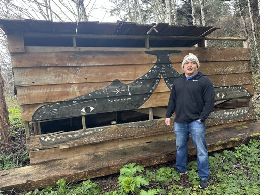 Southwest of town in Neah Bay, Daniel Greene stands in a grassy clearing on the edge of the Pacific Ocean. There is a reconstructed longhouse here, with a painting of a gray whale on its side.