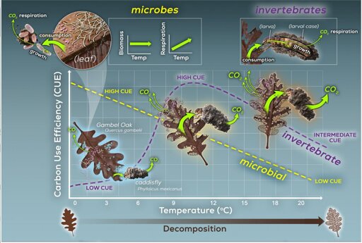 Rising stream temperatures may be weakening the foundation of river food webs by altering how carbon moves through these watery ecosystems. In a new study published in the journal Ecosphere, researchers from Northern Arizona University found that when water temperatures increase, microbes and aquatic insects process fallen leaves, twigs, and bark more rapidly, but a smaller fraction of that leaf litter supports their growth and a bigger fraction is released into the water and air as carbon dioxide.