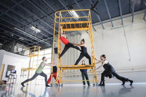 Cameron sinkʷə Fraser-Monroe (centre back), a Tla’amin Nation member and associate artist for Ballet Kelowna, directs dancers during an April 13 rehearsal in syilx homelands for his upcoming production of Cikilaxʷm: Controlled Burn. Photo by Aaron Hemens