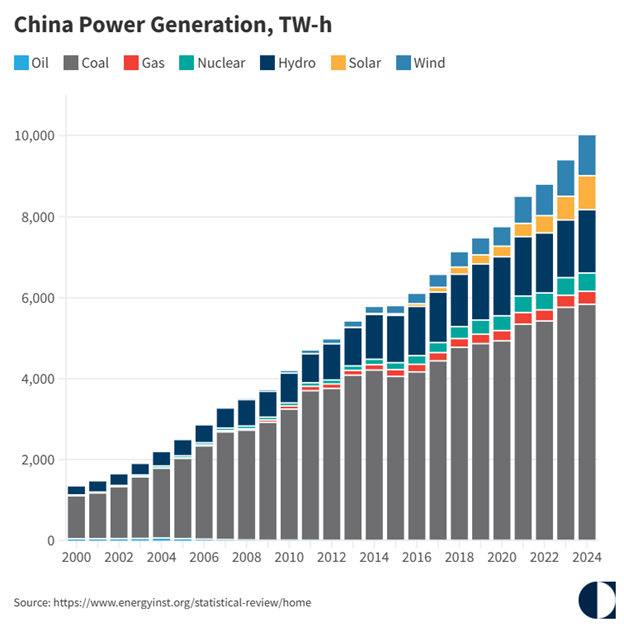 China’s energy demands continue to rise, China’s electricity production continues to grow faster than the rest of the world combined, and gas—that red part of those bars, still represents a small percentage of China’s overall energy mix.