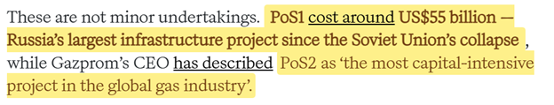 This was an expensive gamble, on Russia’s part, to invest all that money on new pipelines East, to China, when in theory Europe could change their minds and resume buying Russian gas at any moment, or China may pull back their purchases that exceeded contract levels. But then the Middle East blew up, and all of Asia is now a hungry buyer for energy, no matter where from.