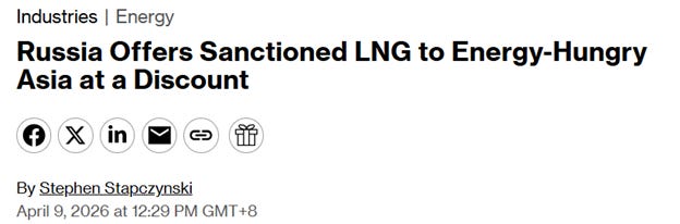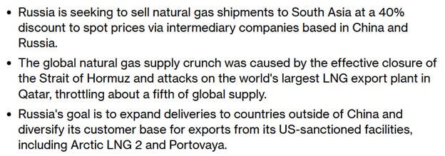 And here is where things get strange again—Russia has so much natural gas, and China already so well supplied, that they are offering discounts to new buyers in Asia, to lock up new gas business forever. The Strait of Hormuz is closed. Liquefied Natural Gas plants in Qatar have been blown up. A fifth of the world’s supply of LNG is off the market. Russia nevertheless is selling at a discount—when at first glance they could charge whatever price they want—but the objective is to expand markets and diversify their customer base in Asia. Trading companies in China and Russia will take the sanctioned energy in trade, and resell it to Asian buyers at a 40% discount to the spot market price.