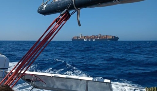 The sailboats approached the cargo ship and transmitted messages via radio, including: “To the crew aboard the MSC Maya: You are heading toward occupied Palestine, carrying tools of death and destruction. Gaza is under siege and its population is suffering collective punishment. Your cargo will fuel an apartheid regime that is committing genocide. Turn back now. Choose humanity over complicity. Choose justice over occupation. The world is watching. The flotilla stands between you and war crimes.”