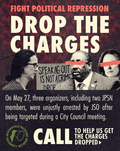 On May 27, 2025, three organizers, including two Jacksonville Palestine Solidarity Network members, were unjustly arrested by the Jacksonville Sheriff’s Office (JSO) after being targeted during a city council meeting. Conor Cauley was violently attacked by JSO officers, and is facing up to 10 years in prison for felony charges of resisting arrest with violence and battery of a law enforcement officer. Activists Leah Grady and Dragon Belloit were also arrested.