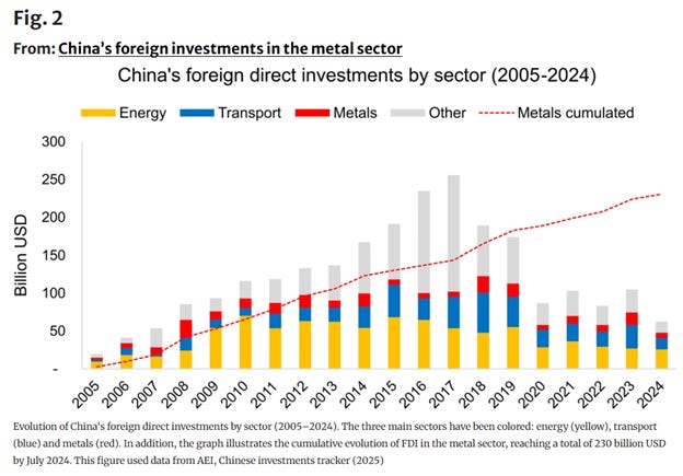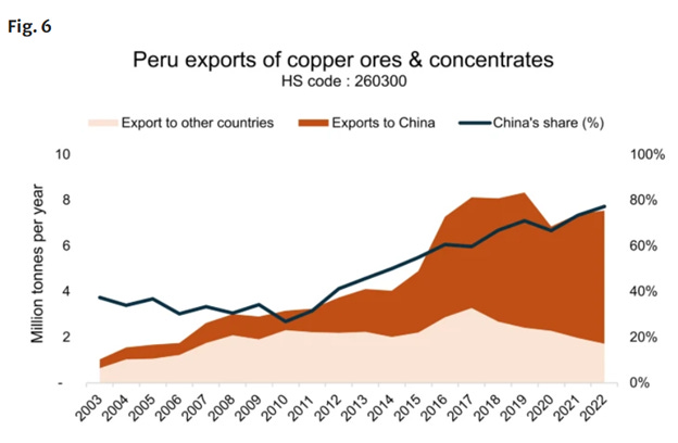 Taking one country, Peru, as an example of how this has played out, over time. In 2003, Peru’s exports of copper ores to China were under one million tons, which was 40% of Peru’s total. So China was a major buyer, and Peru’s copper ores industry grew rapidly until 2013. China Belt and Road was announced in 2013, along with huge increases in outbound FDI to Peru. Now China takes 80% of Peru’s global exports of copper, which today is six million tons: