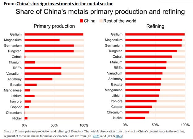 The reliance on China for this supply chain is almost total. The US Geological Survey published their list of 50 critical minerals, and the United States relies on imports for 31 of those fifty – with imports over 50% of demand. And for nine of them, China was the exclusive supplier.