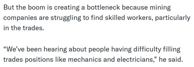 But the problem is a lack of engineers and mine workers. Across the United States and Canada, a severe shortage of skilled tradesmen preclude an expansion of the mining industry.