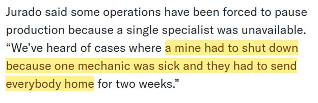 This isn’t a money problem. These companies have plenty of money; what they lack is people. The unemployment rate for skilled tradesmen—and they’re almost all men—is basically zero. And for young people with those skills, there are other options besides hazardous work in extreme weather, usually far from home. Just six percent of mining workers in Canada are under the age of 25. And so well-funded mining projects can fall apart if anything goes wrong on the staffing side—there is just no slack in this system, industry-wide. In China and in the Global Majority countries, there is excess capacity. This scenario, described here, is unthinkable on a Chinese mining project, where one guy isn’t feeling well and the whole company shuts down until he’s better:
