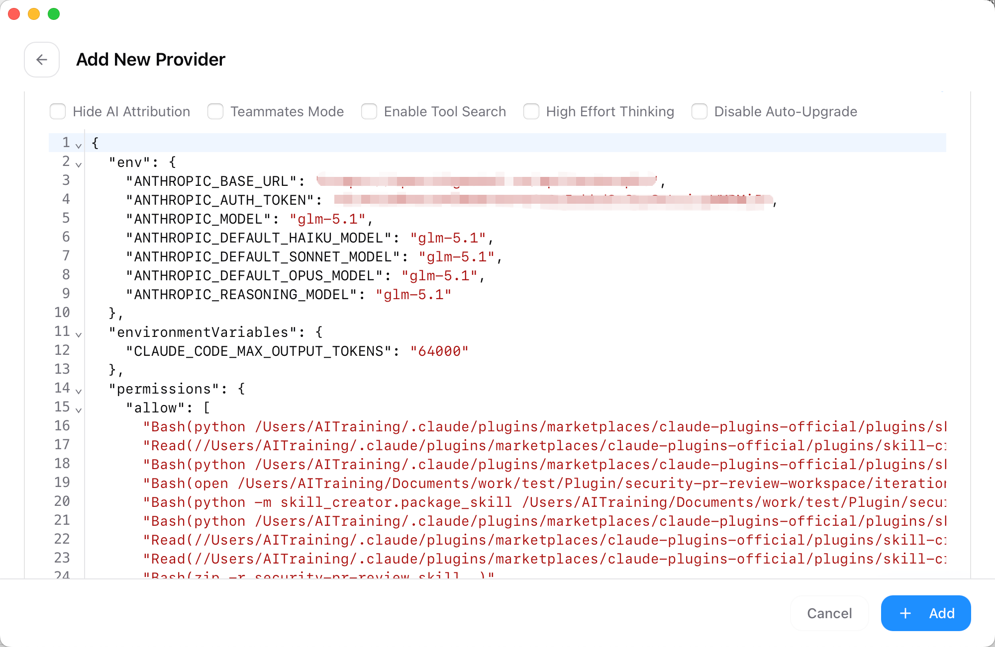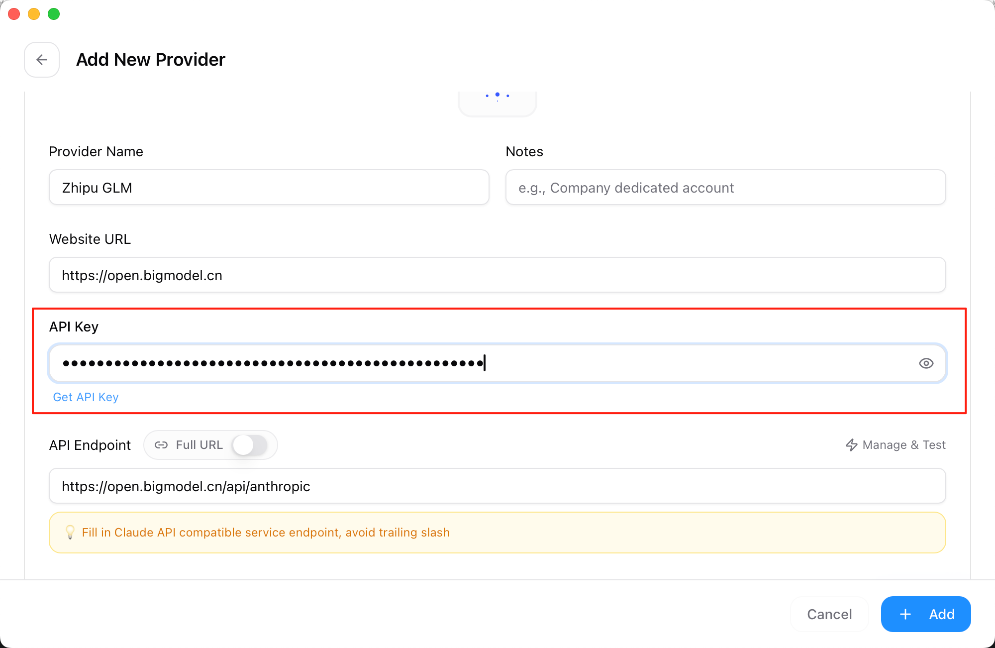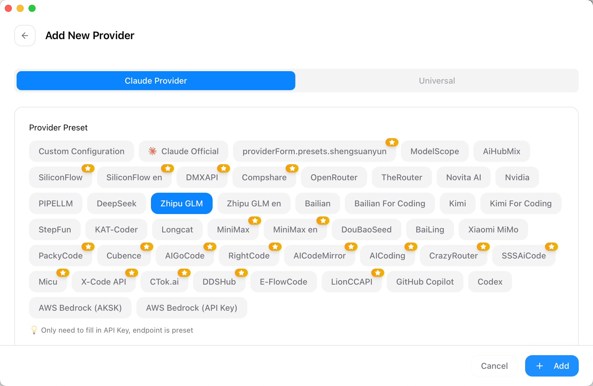 When creating a new profile, you can select common providers such as GLM and Kimi. The software will automatically fill in most required configurations. Below we use GLM as an example; other providers follow the same process.