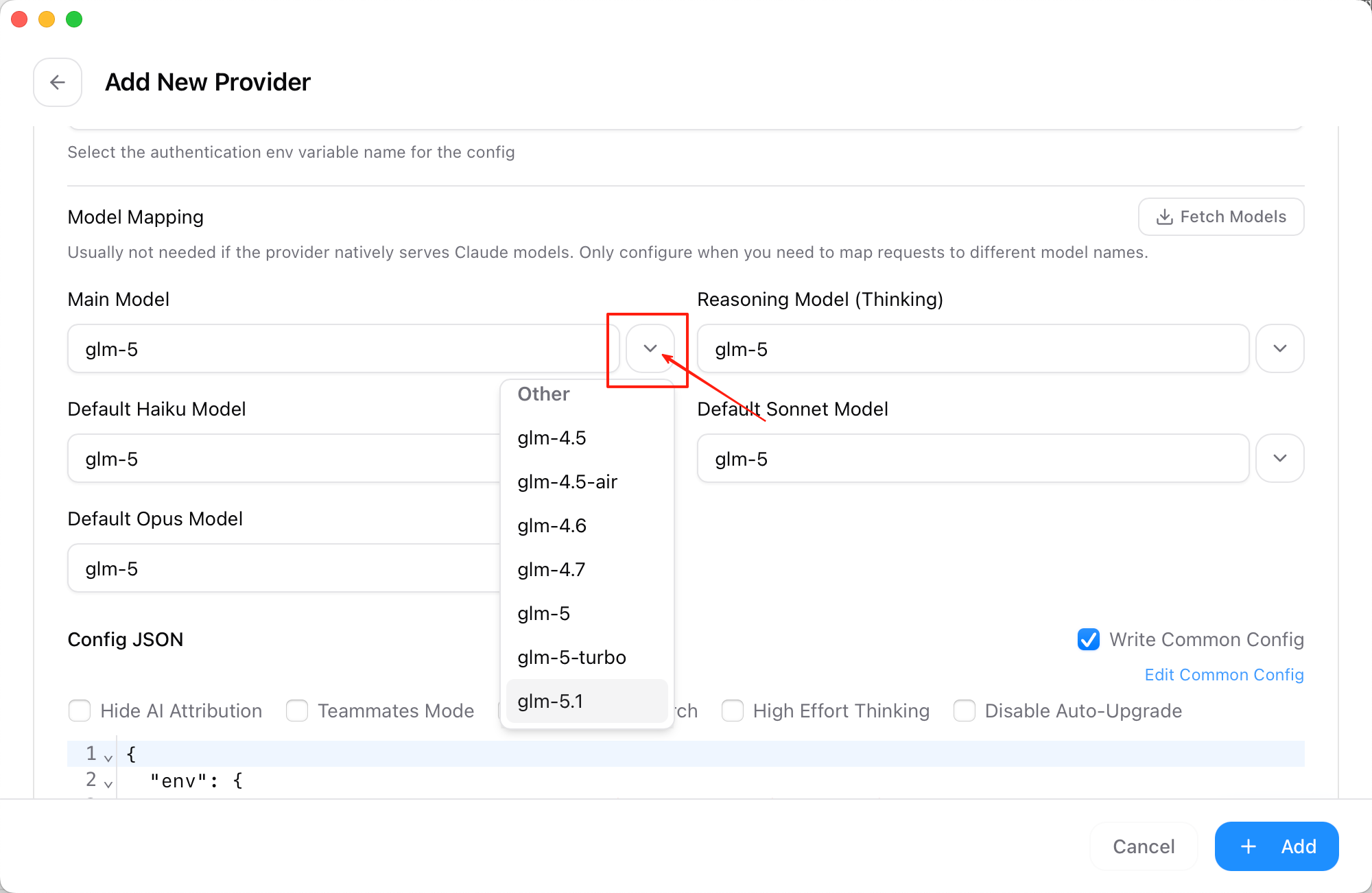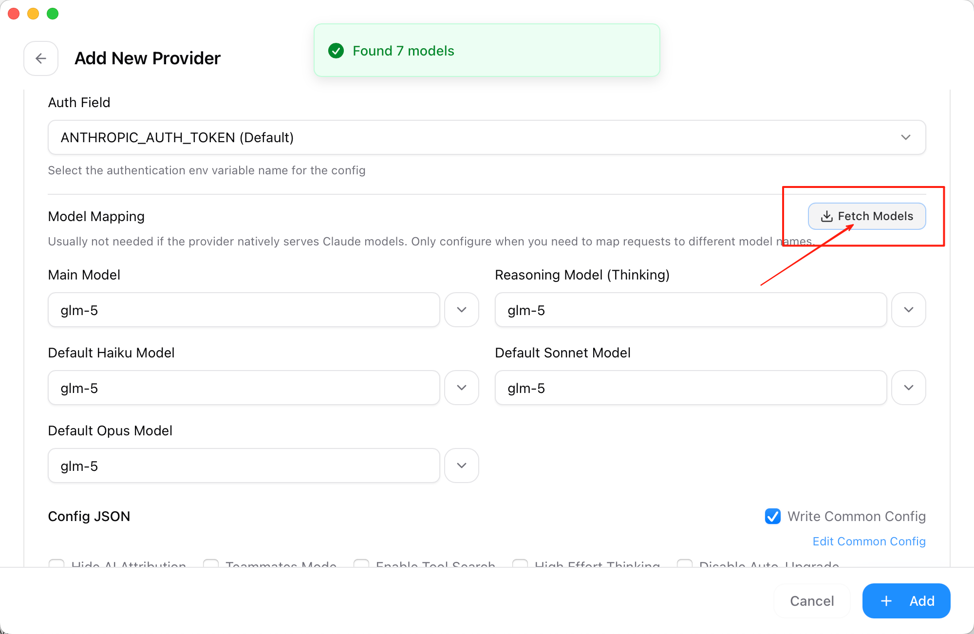 Click ‘Fetch Models’ to load available models from the provider for quick switching.