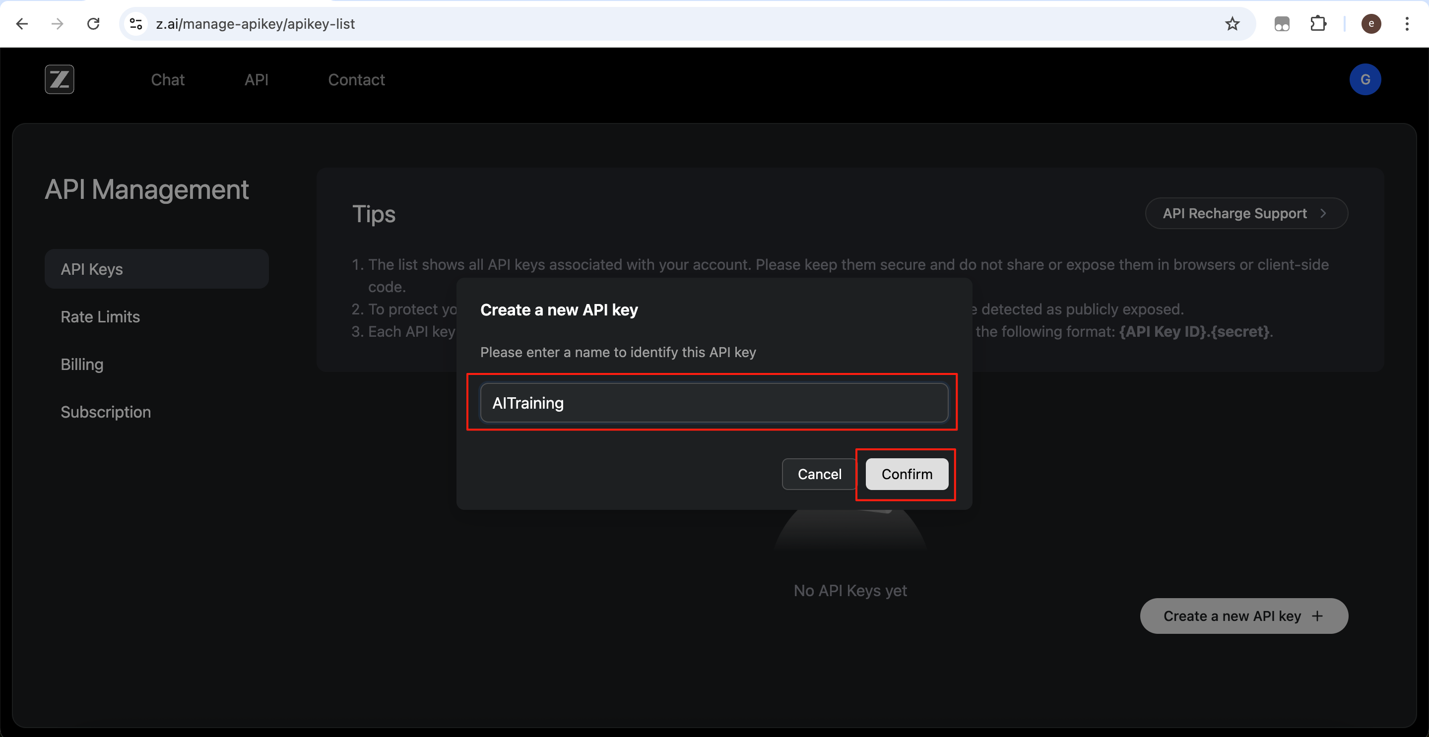 Enter a recognizable name (e.g. ‘AITraining’), then click Confirm.