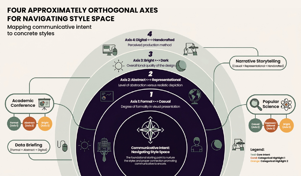 The value of these axes lies in establishing a mapping between communicative intent and concrete styles. When a user states ‘this is for an academic conference’, the search begins in the Formal + Abstract region; when a user states ‘this is popular science content for students’, the search moves toward the Casual + Representational + Bright region.