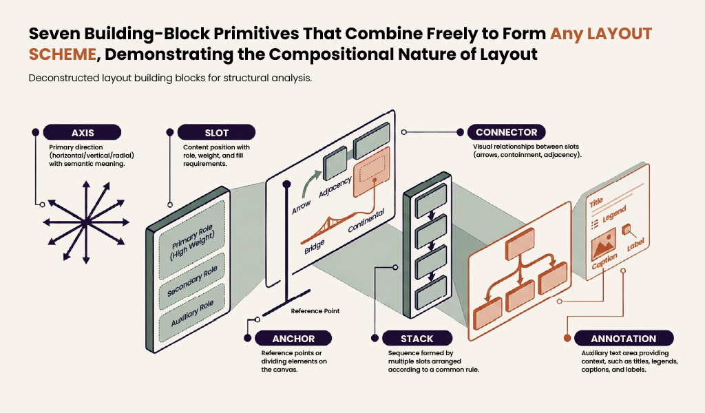 More critically still, these two dimensions possess fundamentally different internal structures. Layout is compositional – it can be decomposed into seven basic primitives that combine freely, much like building blocks. Style is gestalt – its six dimensions are tightly coupled, indivisible, and must be understood as a unified whole. These are not simply theoretical constructs — both emerged from the practice of building Pictorial.