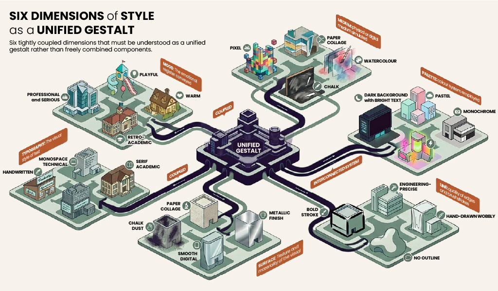 Style answers the question ‘what does the information look like’ – not spatial positions and connections, but colour, materiality, line quality, and mood. Layout, like building blocks, can be taken apart and reassembled; Style, like a painting, cannot have its brushstrokes separated from its palette.