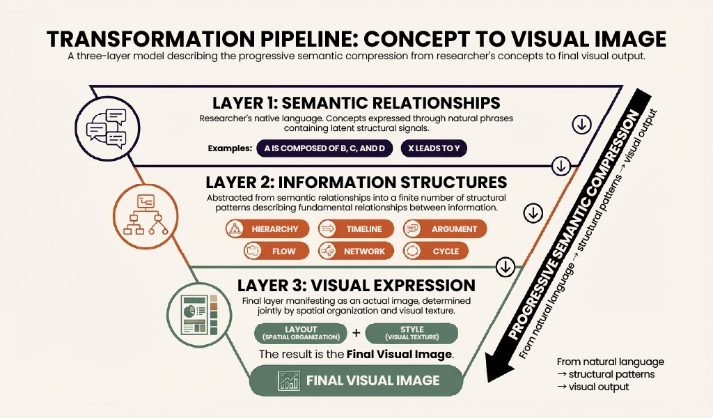 Infographics are not conjured from thin air. Between the concepts in a researcher’s mind and the image ultimately presented to the reader, there exists a process of semantic compression that can be described in three layers.
