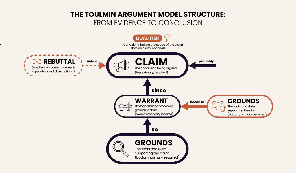 The Toulmin model is a widely adopted framework for argumentation in academic discourse, defining six elements: Claim (the conclusion being argued), Grounds (the facts and data supporting the claim), Warrant (the logical bridge connecting grounds to claim), Backing (the authority or theory that lends credibility to the warrant), Qualifier (conditions limiting the scope of the claim), and Rebuttal (exceptions or counter-arguments). Described in terms of the seven primitives: