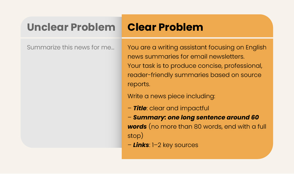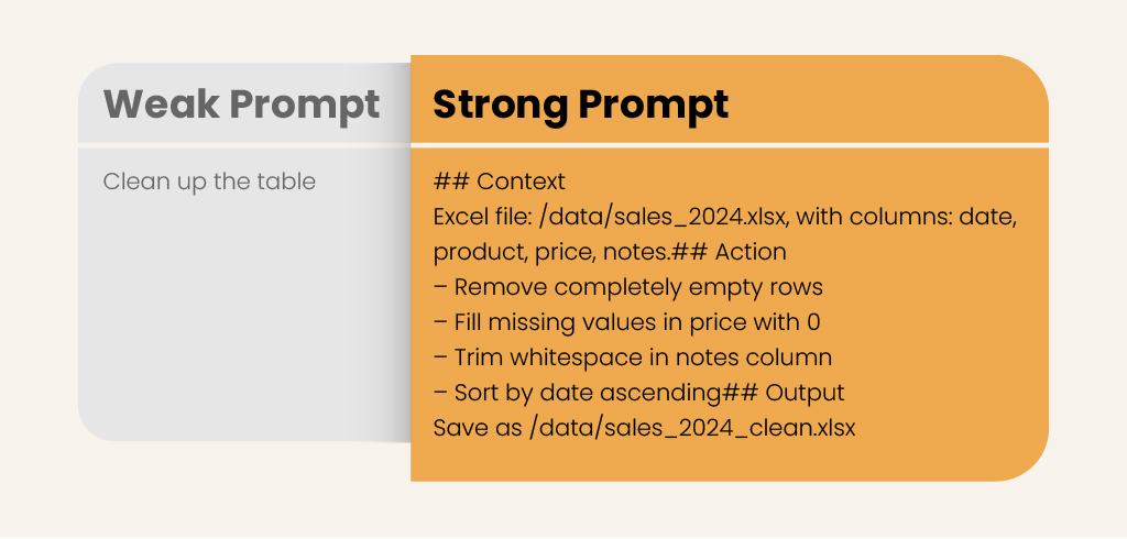 The most common issue is writing too vaguely. You can place these three sections under headings like ## Context / ## Action / ## Output to make skimming easier.