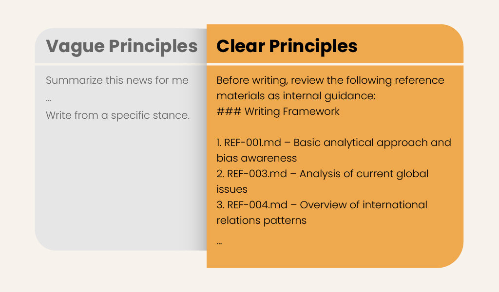 You can use this framework to write each section in Markdown, helping large language models make more consistent judgments rather than relying on a single vague instruction. Below are some comparative examples: