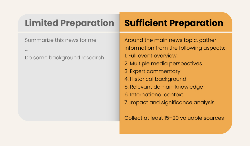 The concept often discussed in education – the shift ‘from prompt engineering to knowledge engineering’ – has a similar core idea: If explanations, reference materials, and checklists are all preserved as structured text, they become more like team assets rather than just personal insights. Here’s an example that illustrates the difference between a weak prompt and a strong prompt.
