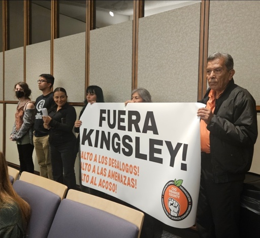 Mientras los residentes hablaban, miembros de CSO OC y residentes desplegaron una pancarta que decía: “¡Kingsley fuera!”. La cámara comenzó a cambiar de ángulo con frecuencia para evitar mostrar la pancarta en la pantalla. En un momento dado, cuatro agentes de la policía de Santa Ana se acercaron a los organizadores y les indicaron que debían trasladarse a la parte trasera si iban a sostener una pancarta, a pesar de que nadie se había quejado de tener la visibilidad obstruida.