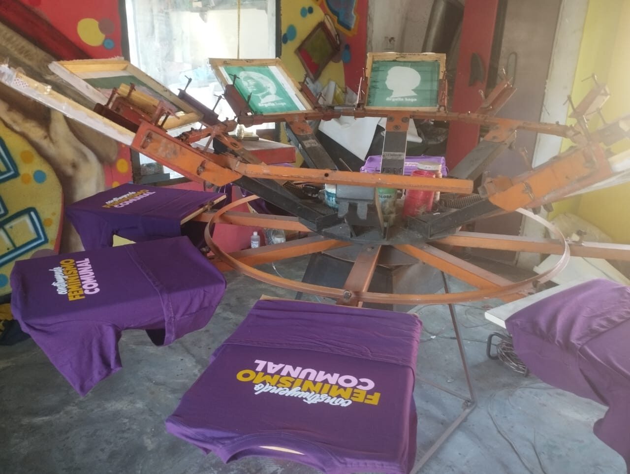 There are six of us now, but we coordinate with other people in the territory and in other parts of the country. We have a set of goals and an action plan. Each person takes on tasks based on their strengths. We have six production units, two of which are currently operational: the auto repair shop, where we fix cars and motorcycles, and the screen printing and communications workshop, where we make T-shirts. We have a brand called “Contestatarixs” to market prints of iconic figures and world-renowned fighters. The other four units are a cultural café that we will soon reopen, a community bakery, a recording studio, and a greenhouse. In fact, we plan to establish a greenhouse in every community council.