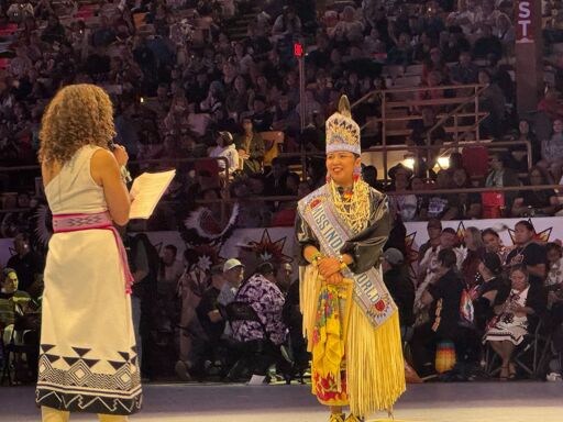 The crowd cheered for Dania Wahwasuck, the last woman to hold the title, when she spoke of her time as Miss Indian World, handing off her crown and sash before she left the stage.