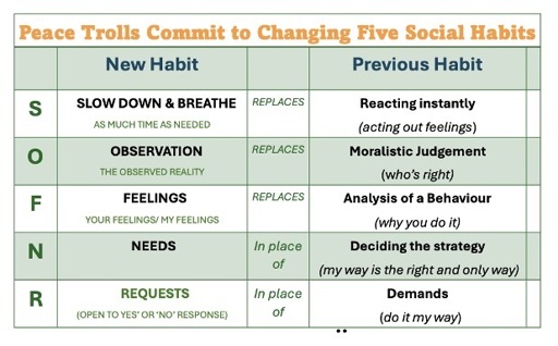 S – slows to take time to breathe deeply, using self-empathy to acknowledge personal feelings and what unsatisfied need may lie underneath. Before going further, reminding themselves of the Peace Trolling premise that however expressed, a comment is simply ‘the best way at that moment that person could find to meet their need.’