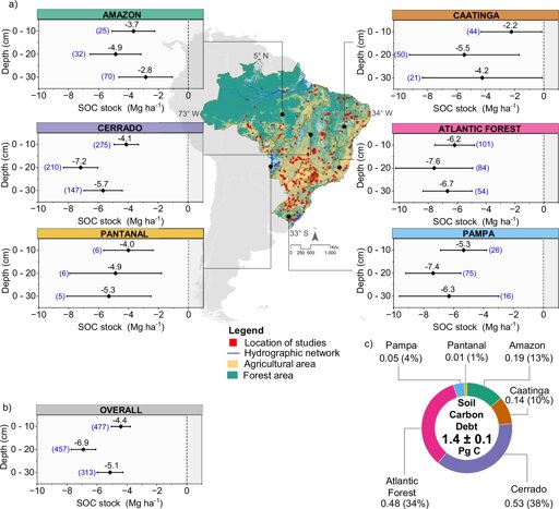 The conversion of Brazil’s native biomes into agricultural areas has resulted in an estimated loss of 1.4 billion tons of soil carbon. This amount is equal to the emission of 5.2 billion tons of carbon dioxide (CO₂) equivalent, a unit of measurement used to standardize the emission of different greenhouse gases, and was calculated based on data collected from studies conducted over the past 30 years.
