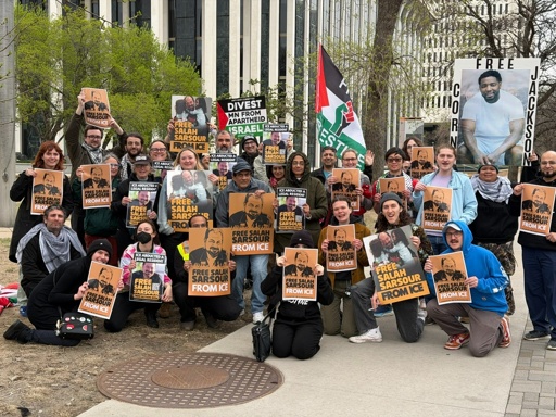 Minneapolis, MN – On the evening of Saturday, April 25, 50 members of the Twin Cities community rallied downtown Minneapolis to demand the release of Salah Sarsour from ICE custody. Sarsour serves as president of the Islamic Society of Milwaukee and is a board member for American Muslims for Palestine. He has been an organizer for the Palestine movement in Milwaukee, Wisconsin for decades. Saturday’s protest was organized by the Twin Cities chapter of American Muslims for Palestine and the Minnesota Anti-War Committee.