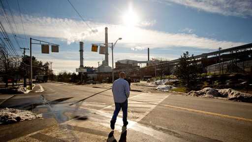 Ryan Pickoski walks toward the Verso paper mill in Bucksport on Thursday, December 4, 2014, the day before the number 1 paper machine was scheduled to make its last run. Photo by Gabe Souza/Portland Portland Press Herald via Getty Images.