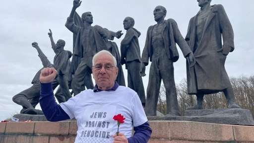 On April 12, KiB participants joined a vigil where previously excluded voices spoke, including the Russian cultural attaché, barred from official ceremonies since 2022. Thomas Geggel (KiB), son of a Holocaust survivor, criticized German memory politics as “falsifying history” and Germany’s rearmament leadership. He called Israel “fascist,” described its wars on Palestinians, Lebanon and Iran as fascist policy, and contrasted remembrance of the Warsaw Ghetto uprising with the “Ghetto of Gaza”.