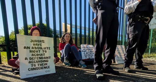 On Wednesday morning, police arrested protesters outside the court, who were holding signs saying: “Juries have an absolute right to acquit a defendant according to their conscience.”