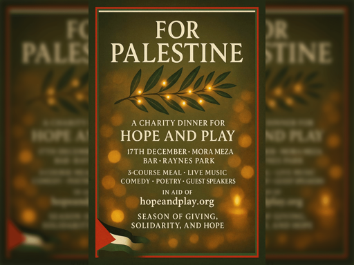 Anti-genocide activists are organising a “For Palestine” charity dinner on Wednesday, 17 December at the Mora Meza Bar in Raynes Park, South London. Organisers describe it as: an evening of good food, live entertainment, comedy, poetry, and guest speakers all in support of Hope and Play, a charity helping children in Gaza. All funds raised […]
